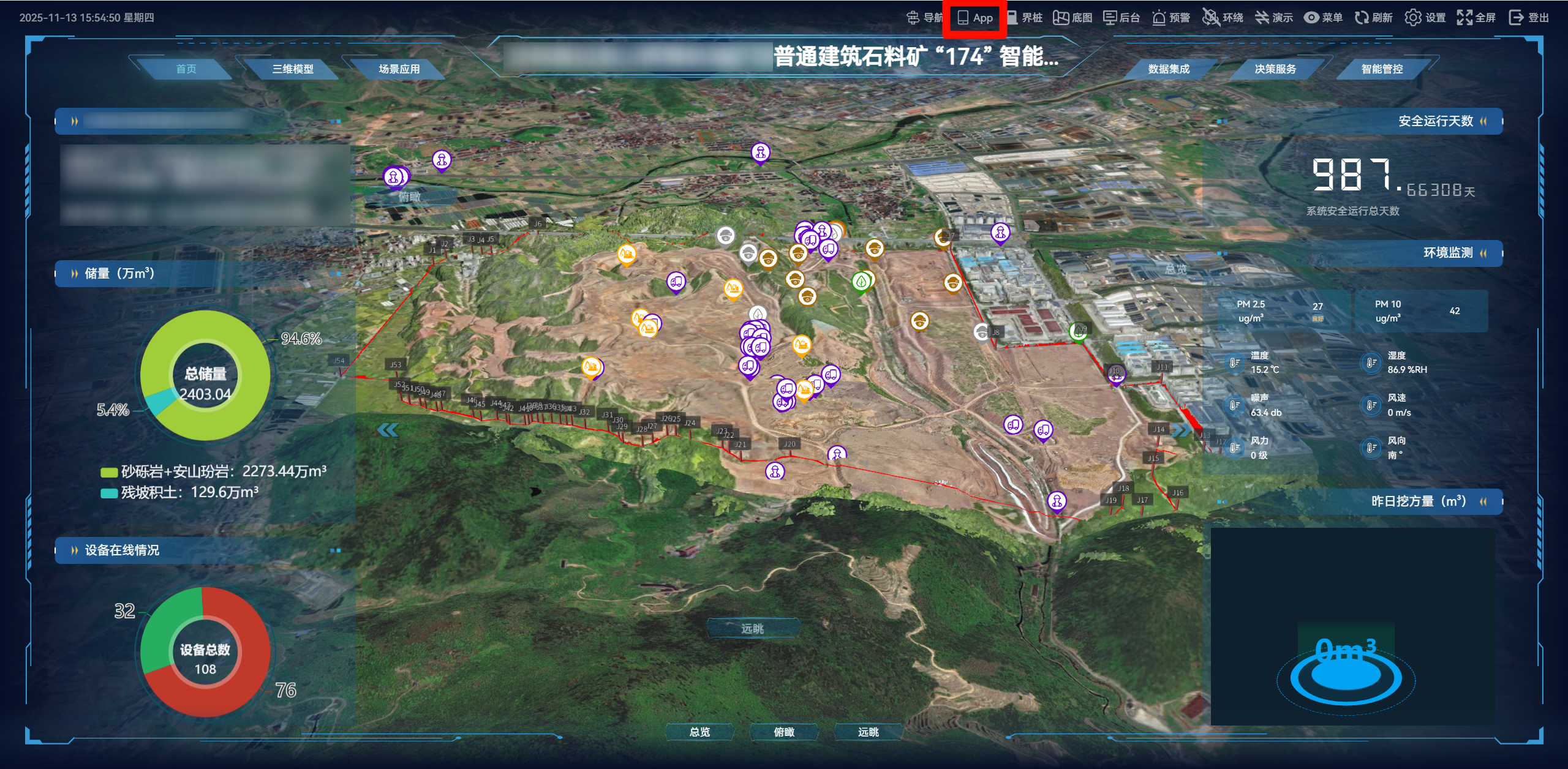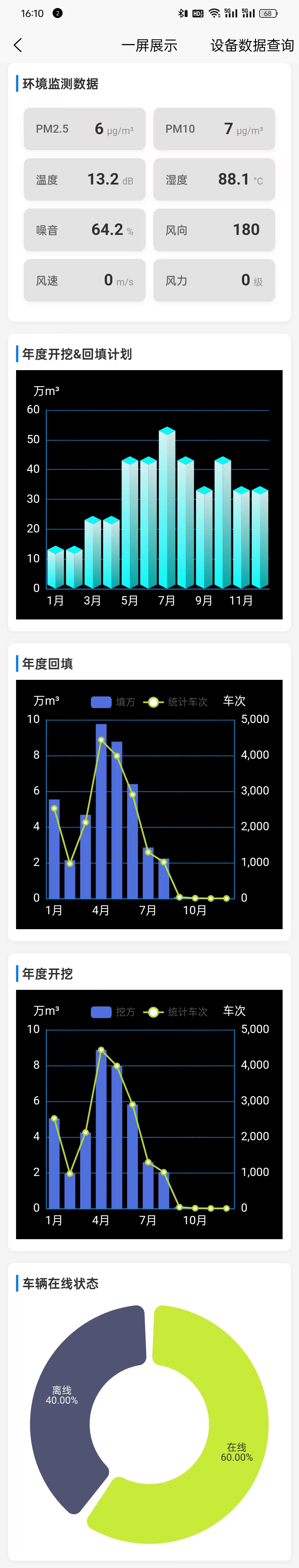 可以直接从主页进入,也可以从【数据报表】部分跳转。【一屏显示】部分有环境监测实时数据、年度开挖计划、回填计划、车辆在线状态、人员在线状态、视频监控在线状态、预警监控数据。