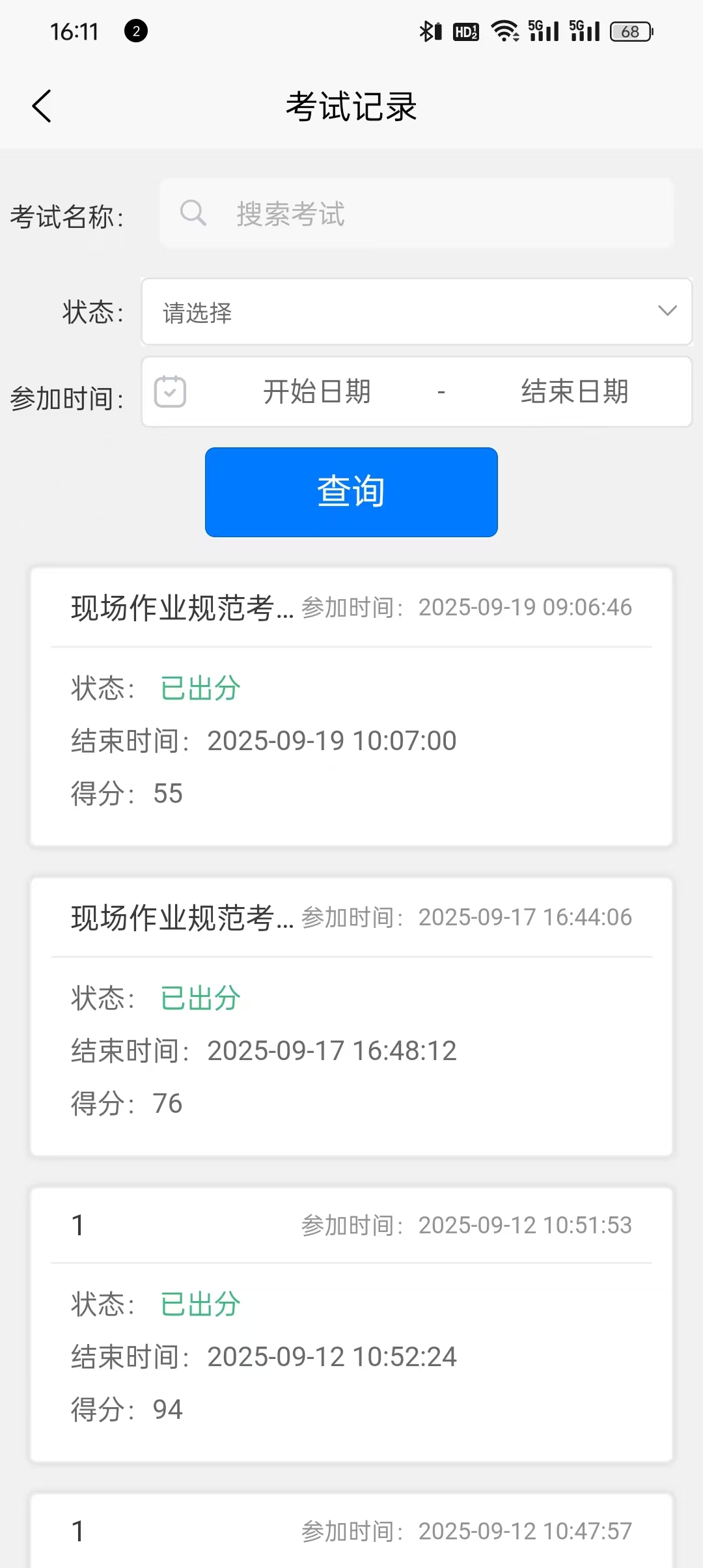 在参与考试之后,可以在“考试记录”里面看到之前的考试记录,可以根据状态、参加时间或者关键词直接搜索考试记录。在此页面即可以看到考试的大致信息和当前试卷的得分(已出分的状态下)。