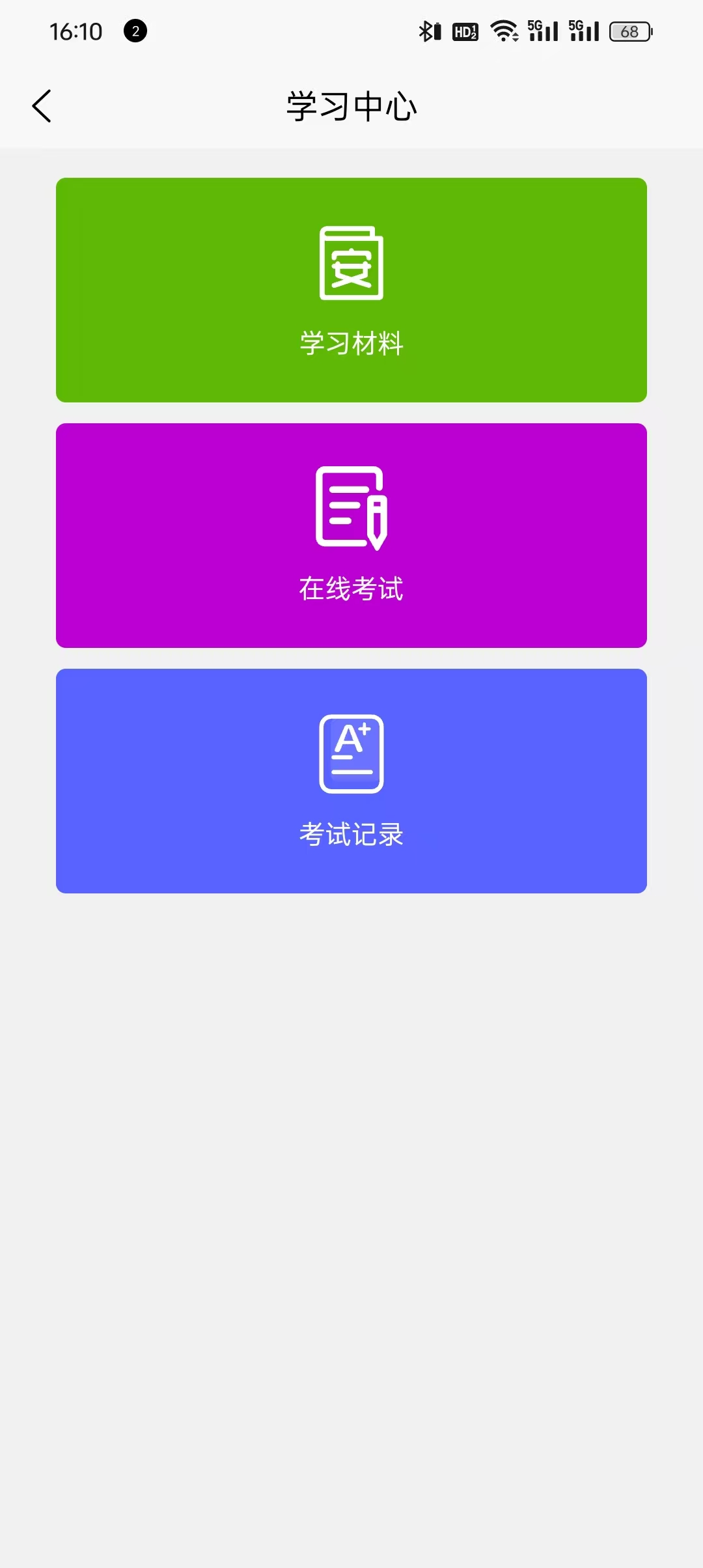 学习中心总体展示教育培训部分内容的总览,可以直接点击跳转至“学习材料”、“在线考试”、“考试记录”模块。
