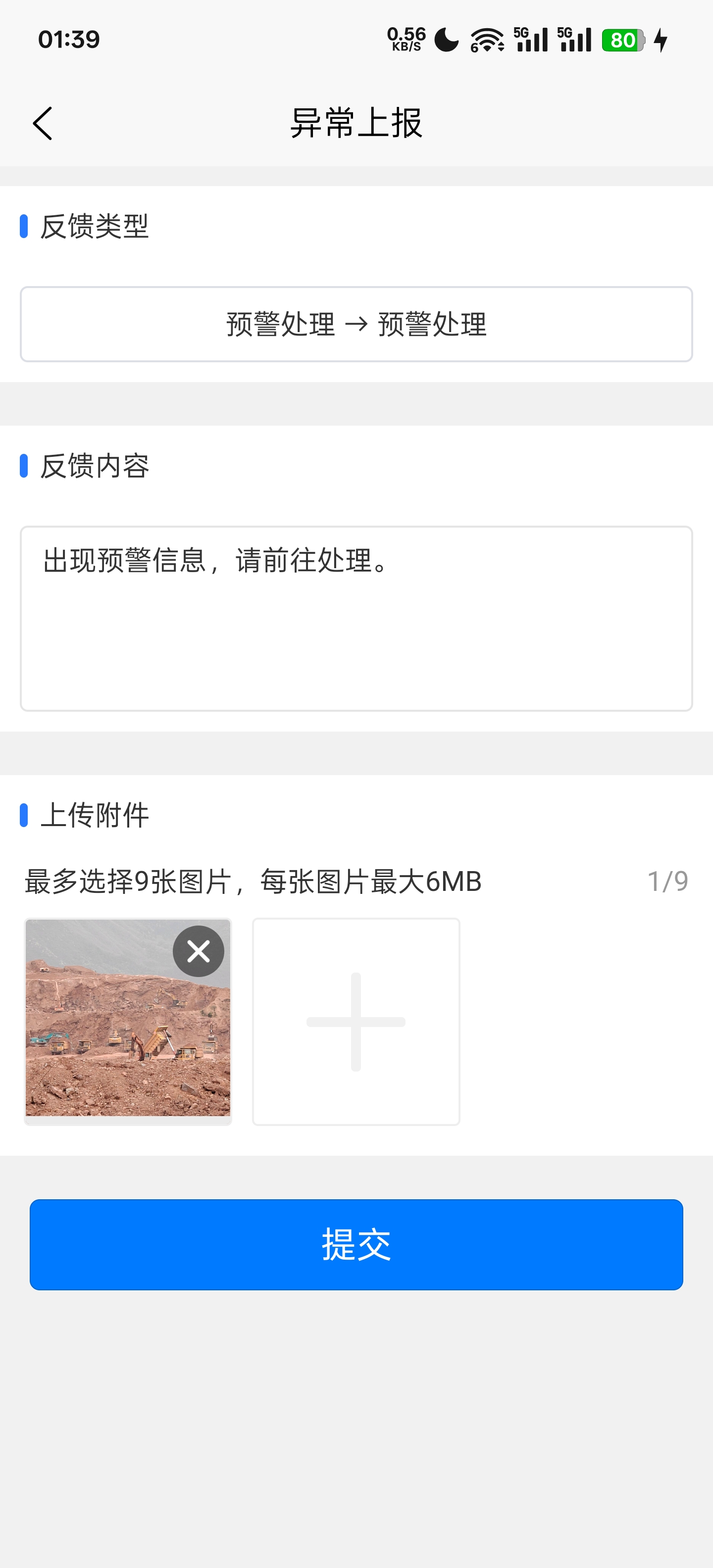 点击异常上报,系统会弹异常上报的界面,只需选择反馈类型、反馈内容、上传图片或现场拍摄图片。
