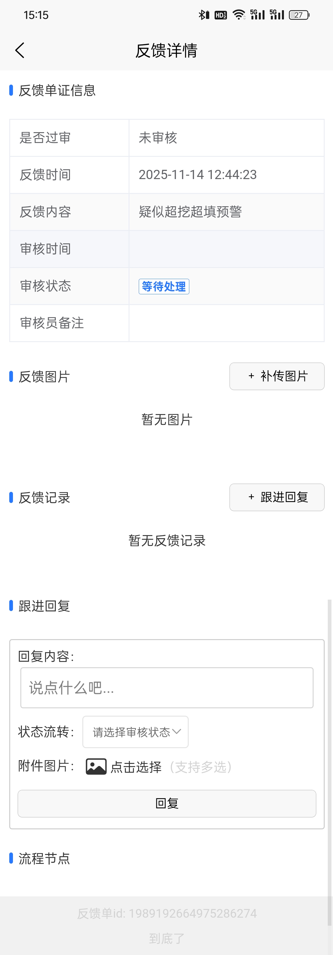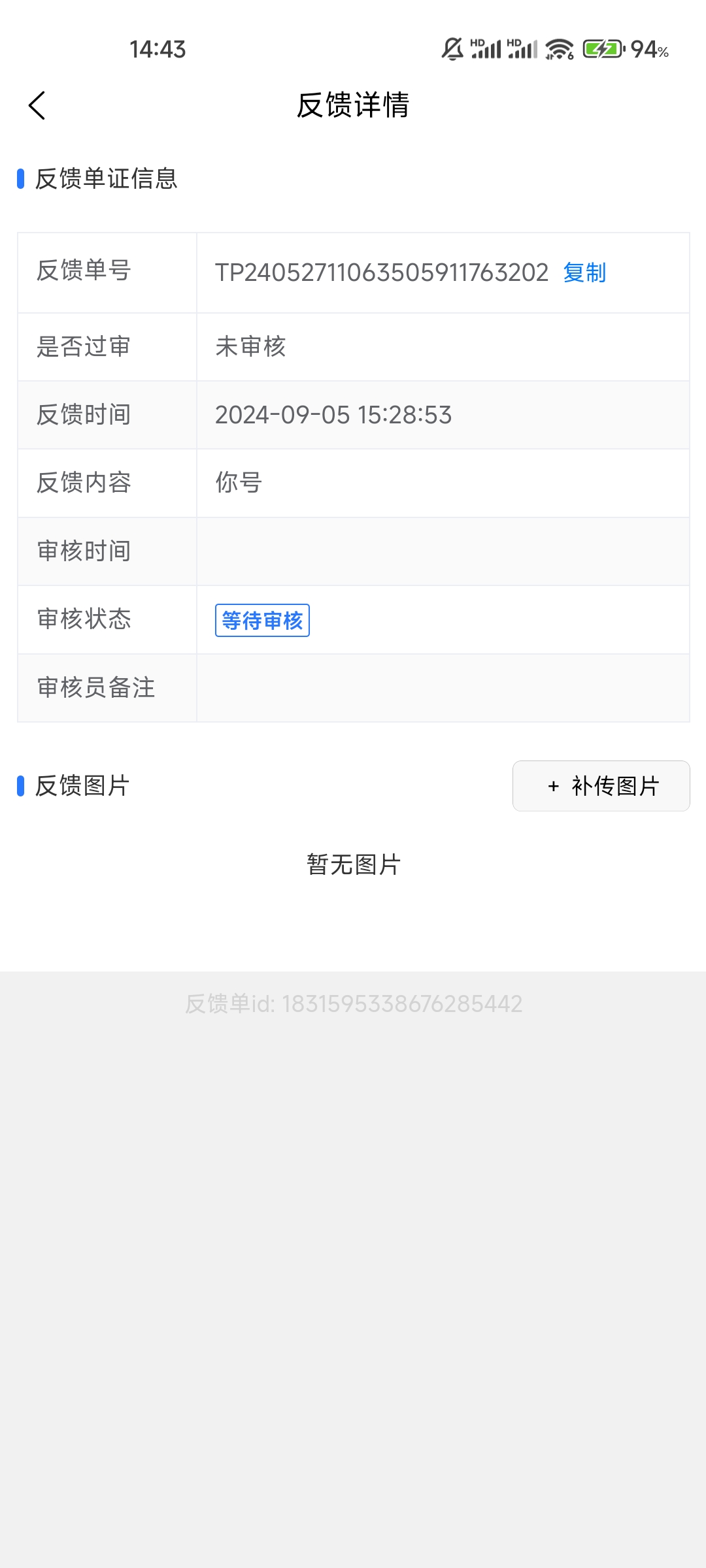 点击单个反馈记录会显示反馈详情,可以查看反馈单号、过审状态、反馈时间、内容、审核时间、状态、备注情况,以及可以补充反馈图片。