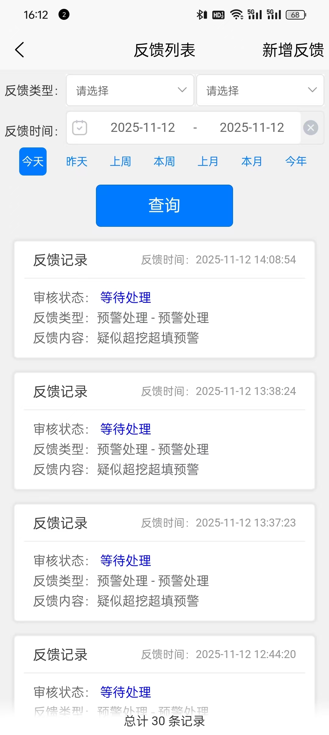 点击反馈列表,系统会弹反馈记录的界面。系统设置了几个常用查询时间可以快速选择:今天、昨天、上周、本周、上月、本月、今年。也可以在时间框中自定义时间区间,点击查询,系统会显示相应的运单和当前查询时间内的反馈列表。反馈记录会显示对应的反馈时间、审核状态、反馈类型和内容。