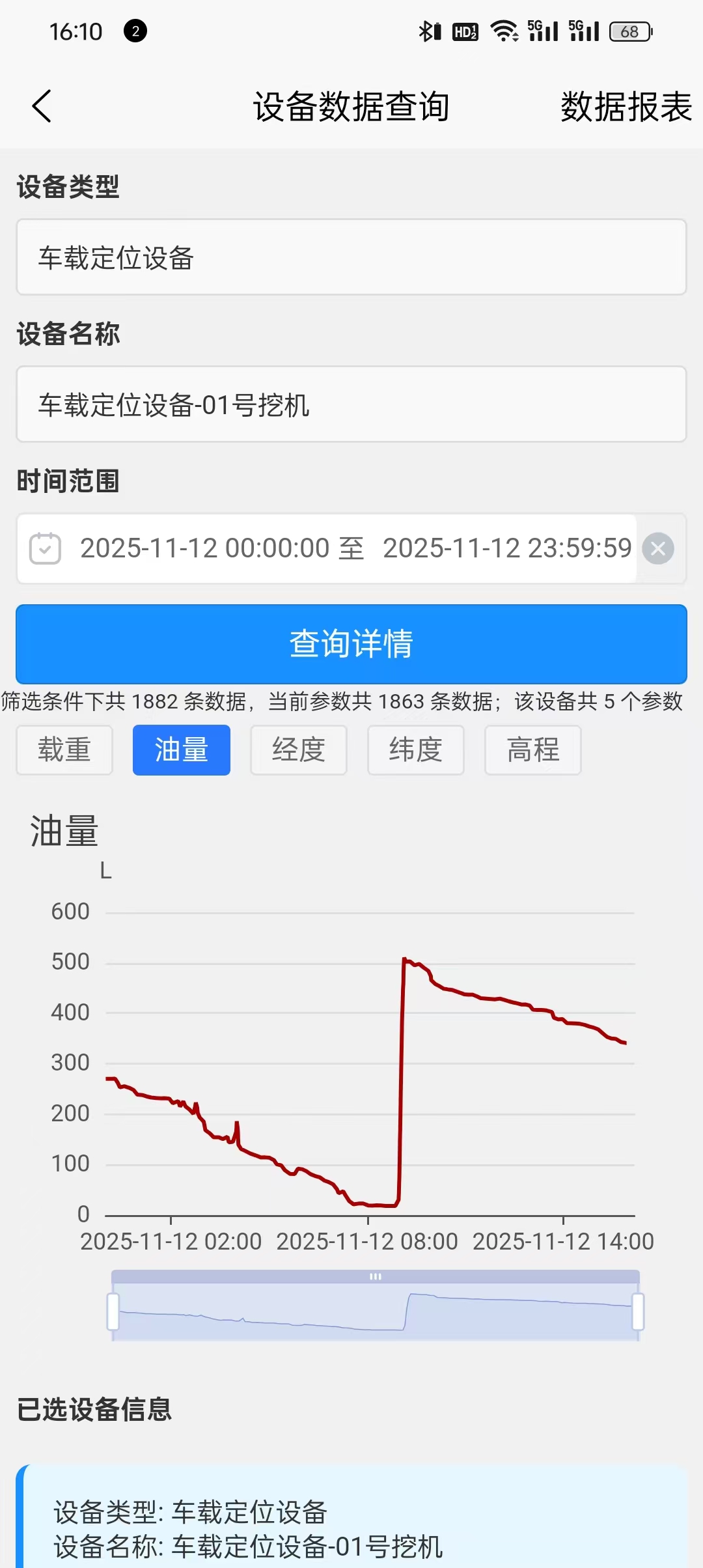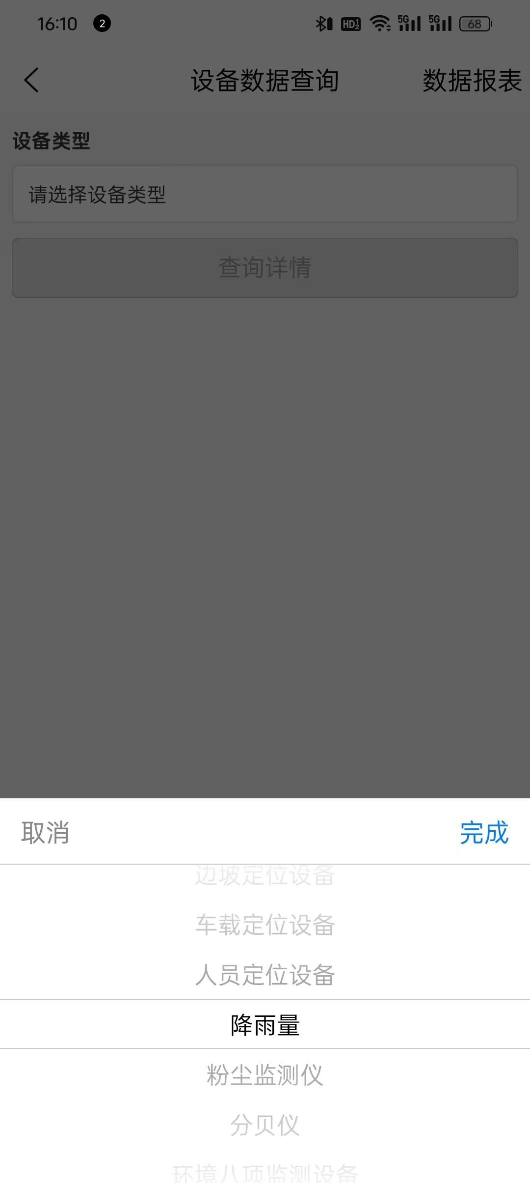 可以选择直接从主页进入、一屏显示的右上角进入、数据报表页面进入,一共三种跳转进入方式。 点击选择设备类型(边坡定位设备、车载定位设备、人员定位设备、降雨量、粉尘监测仪、分贝仪、环境八项监测设备、爆破振动设备、地下水位、其他设备、激光雷达、视频监控、疲劳驾驶摄像头、智能盒子、水量计、水位计等设备)。点击查询详情之后,下图表就会显示所查项的历史数据折线图,可以选择任意时间内的数据统计。