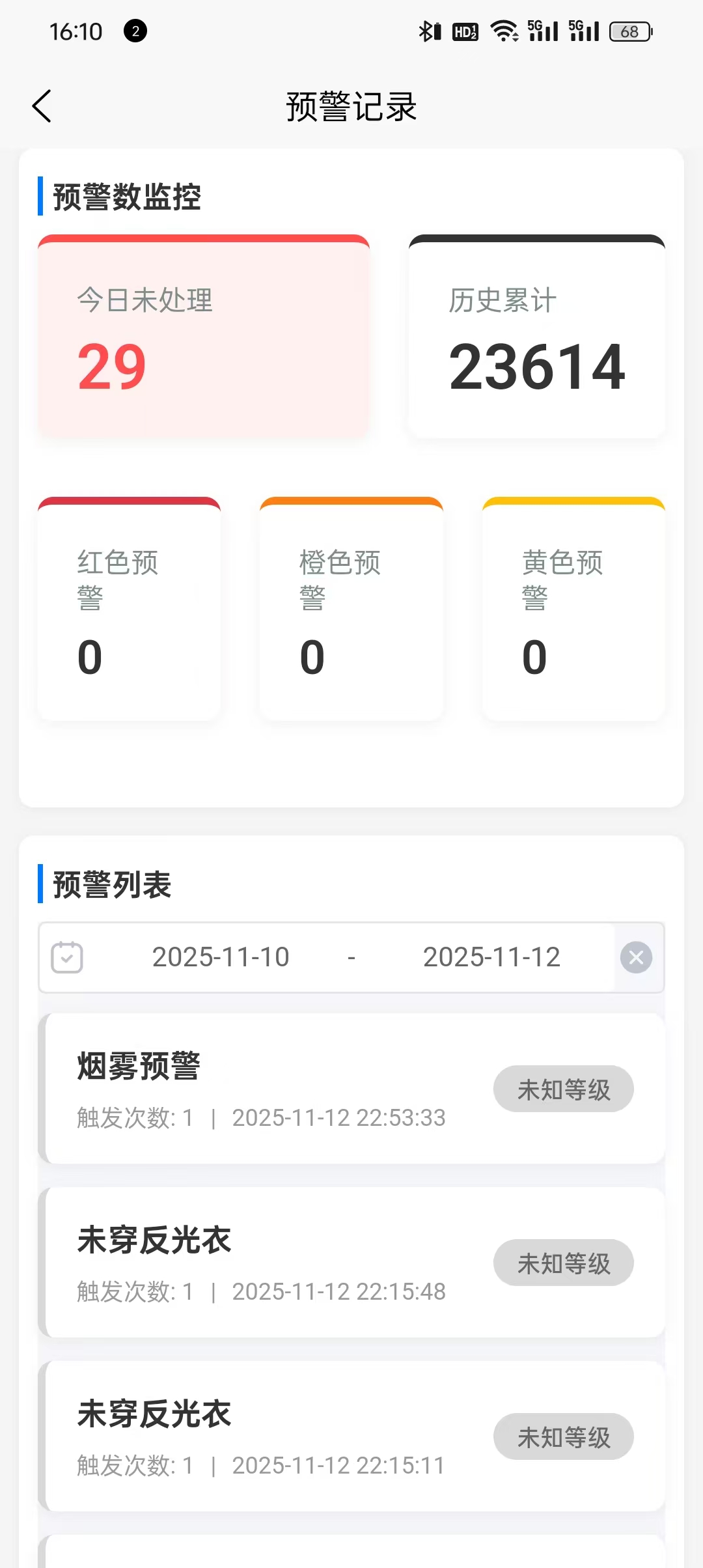 通过主页直接点击或者通过【数据报表】跳转。 显示预警数监控总览,包括当前告警、历史总计、红色预警、橙色预警、黄色预警的统计数据。 预警列表按时间顺序详细的展示当前预警的详细情况,可以直观的查看预警。