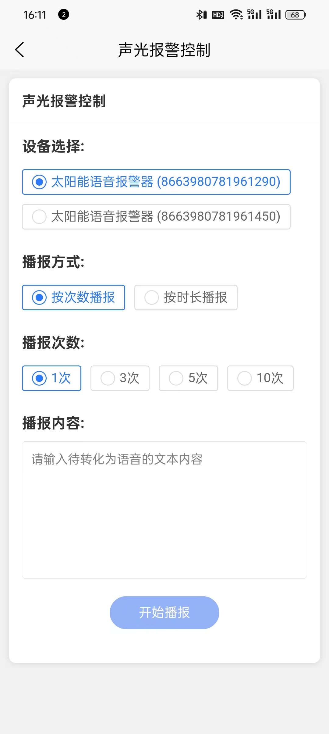 可以进行声光报警,选择需要报警的设备、播报方式(按次数播报、时长播报)、播报次数/时长,然后输入需要播报的内容(待转化为语音的文本内容),之后点击开始播报就会在对应的设备上进行显眼的灯光闪烁和输入内容的语音广播。