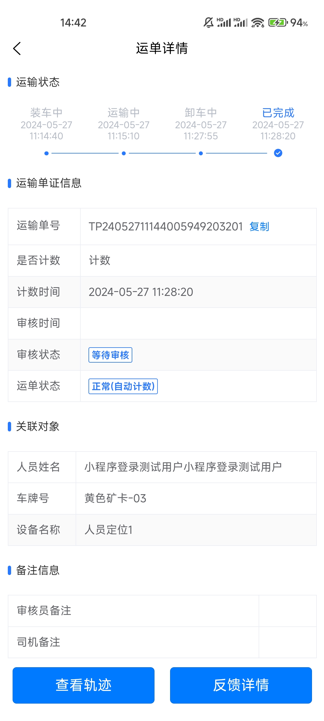 点击单个运单,会显示当前运单的详细情况,包括运输状态和时间、单号、审核状态、运单状态、关联车辆和设备、备注信息等。