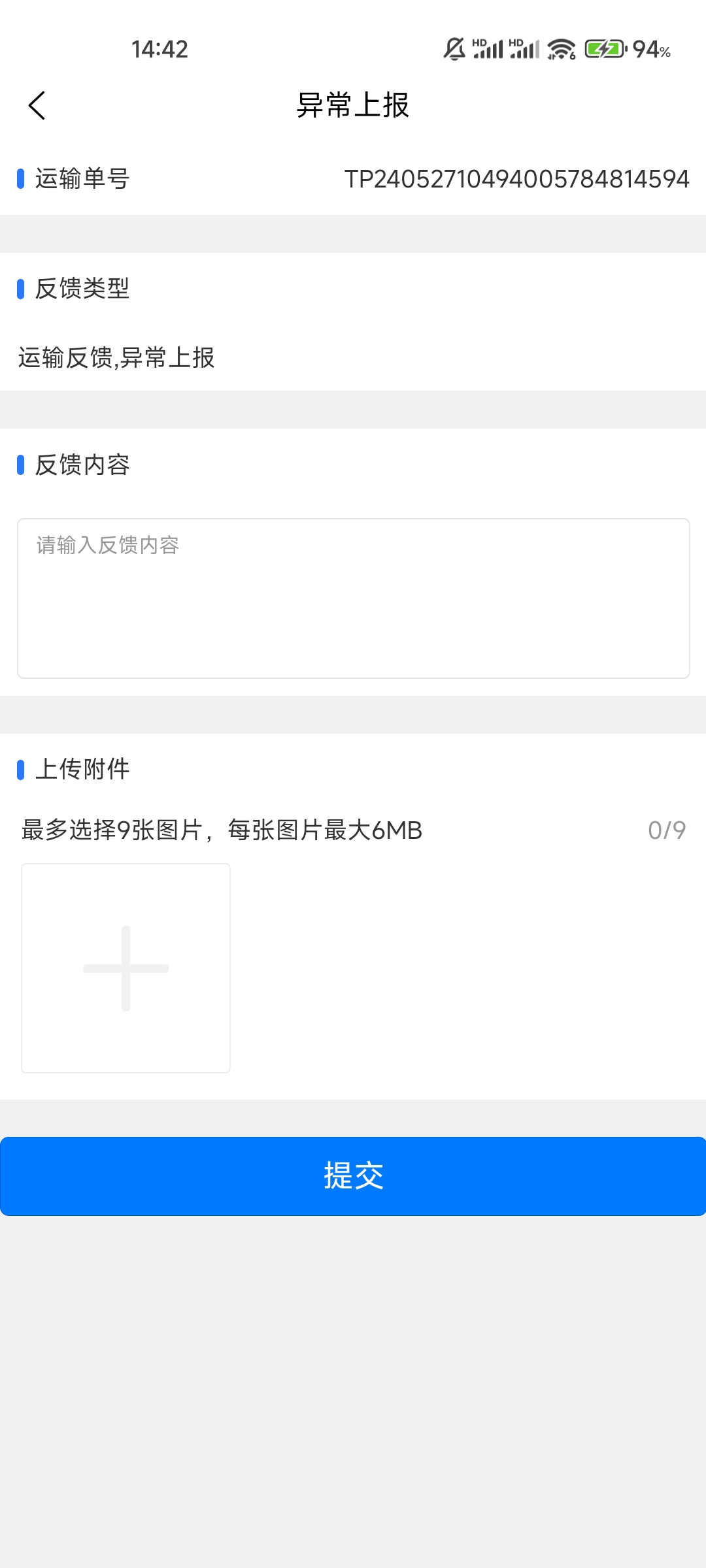 点击对应运单的‘运单反馈’,可以针对该订单进行反馈,可以自选反馈类型,输入反馈内容,上传附件图片。
