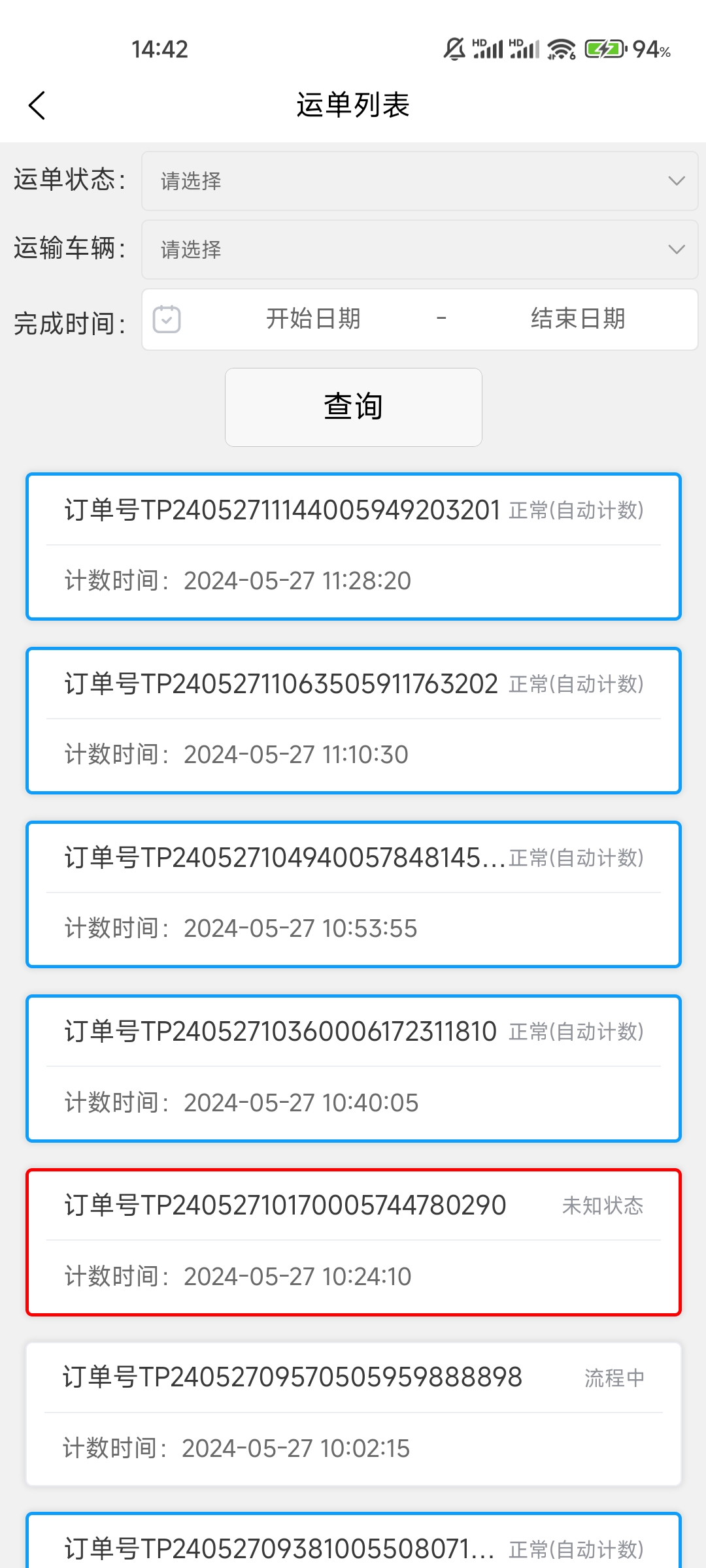 系统会弹出当前的自动调度情况。系统会弹出当前的运单列表,默认是当天的调度记录。系统设置了几个常用查询时间可以快速选择。也可以在时间框中自定义时间区间,点击查询,系统会显示当前查询时间内的运单记录。
