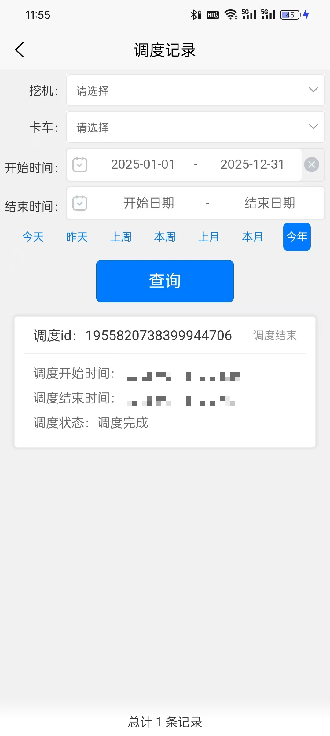调度记录卡片会显示调度 id、调度开始/结束时间、调度状态。