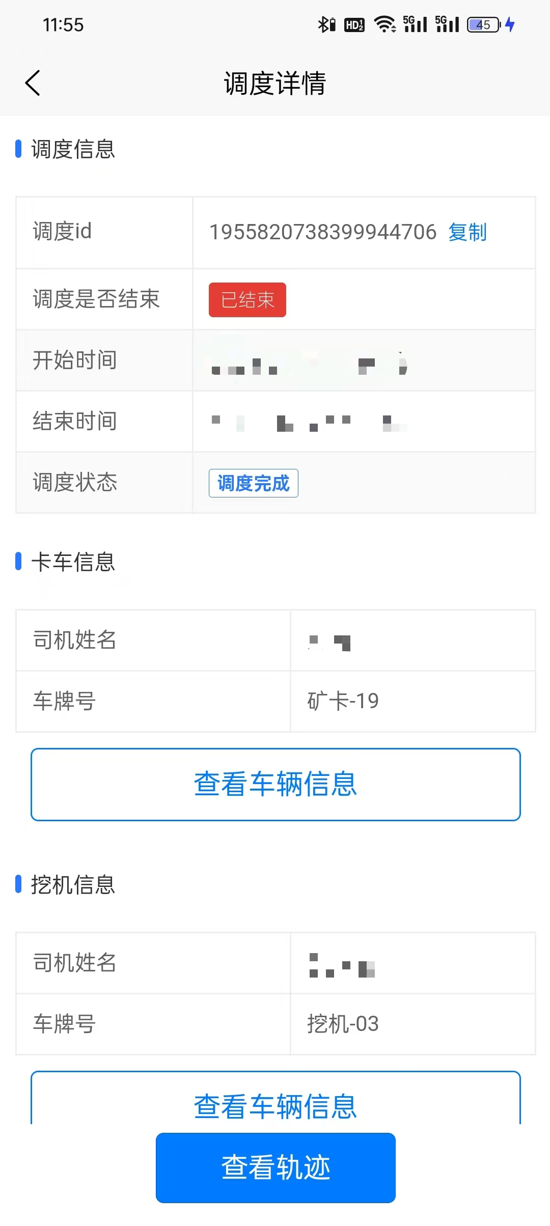 调度详情 点击单个记录可以查看详情,除了记录卡面会显示的内容,还有参与调度的卡车、矿车和人员的基础信息。