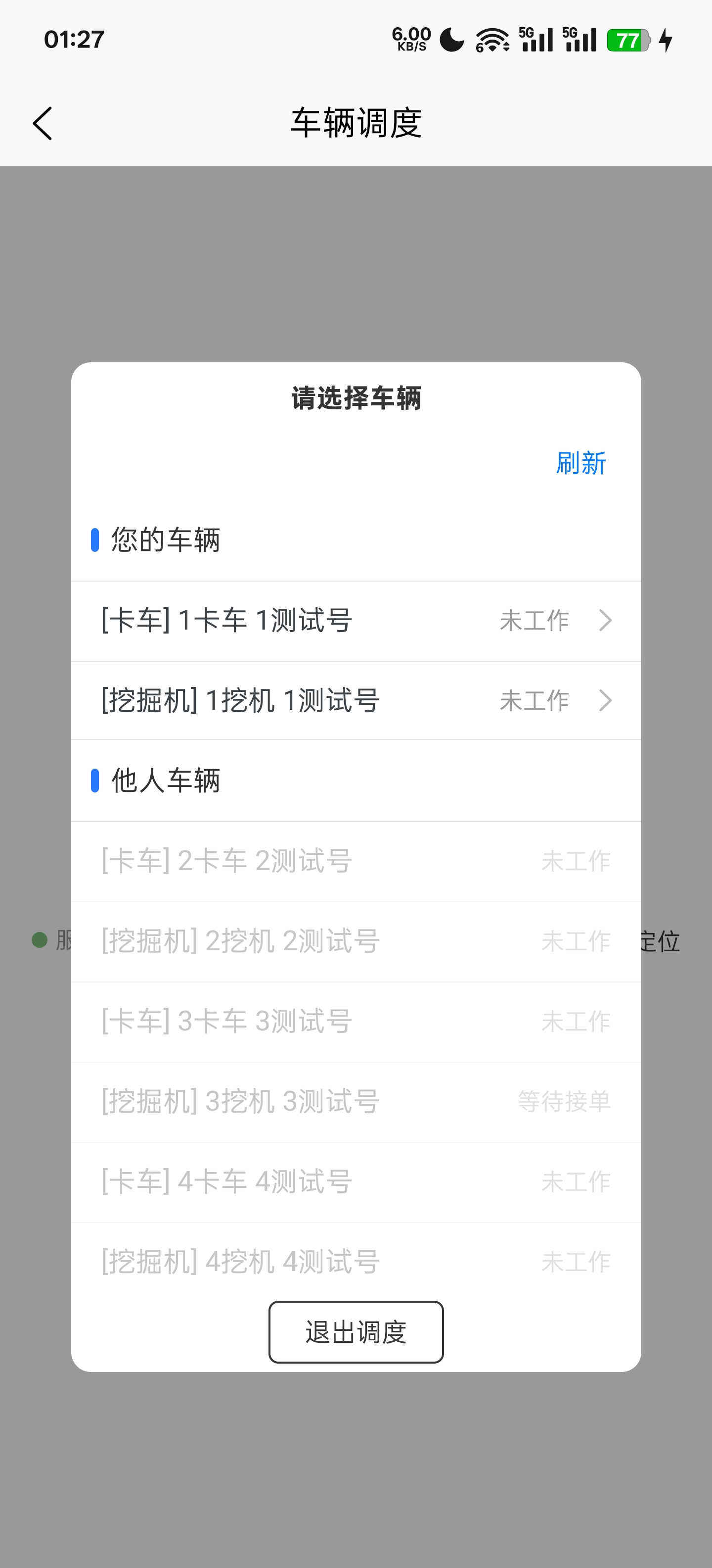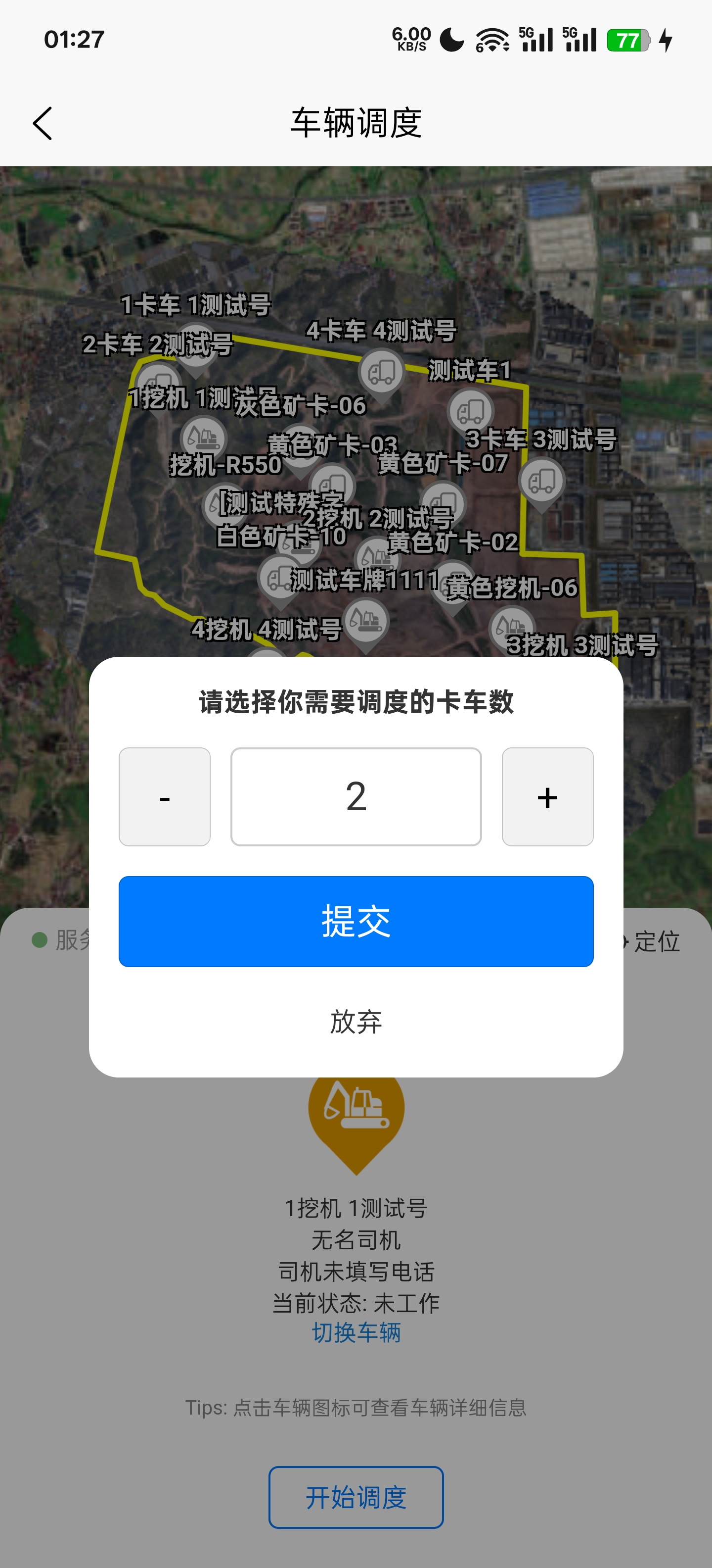 点击进入调度页面,首先先选择调度车辆(需要卡车和挖机同步调动,需要将预备调度车辆切换至工作模式才可以调度)。