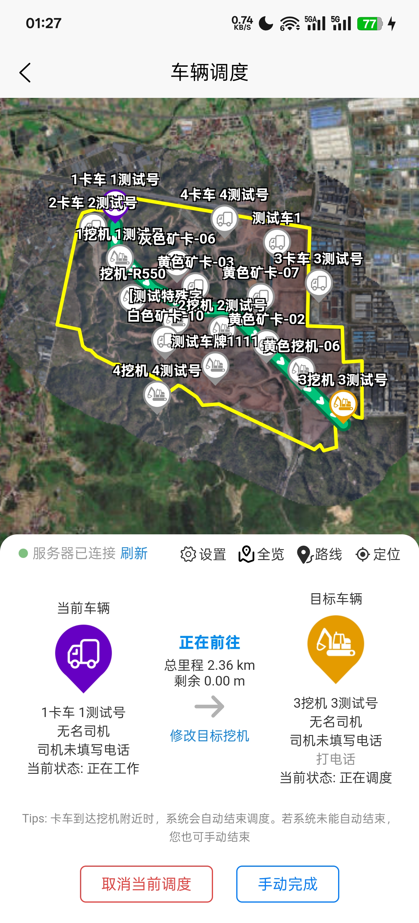 可以随时手动进行取消调度或者完成调度,同时卡车到挖机附近之后也会自动结束调度。